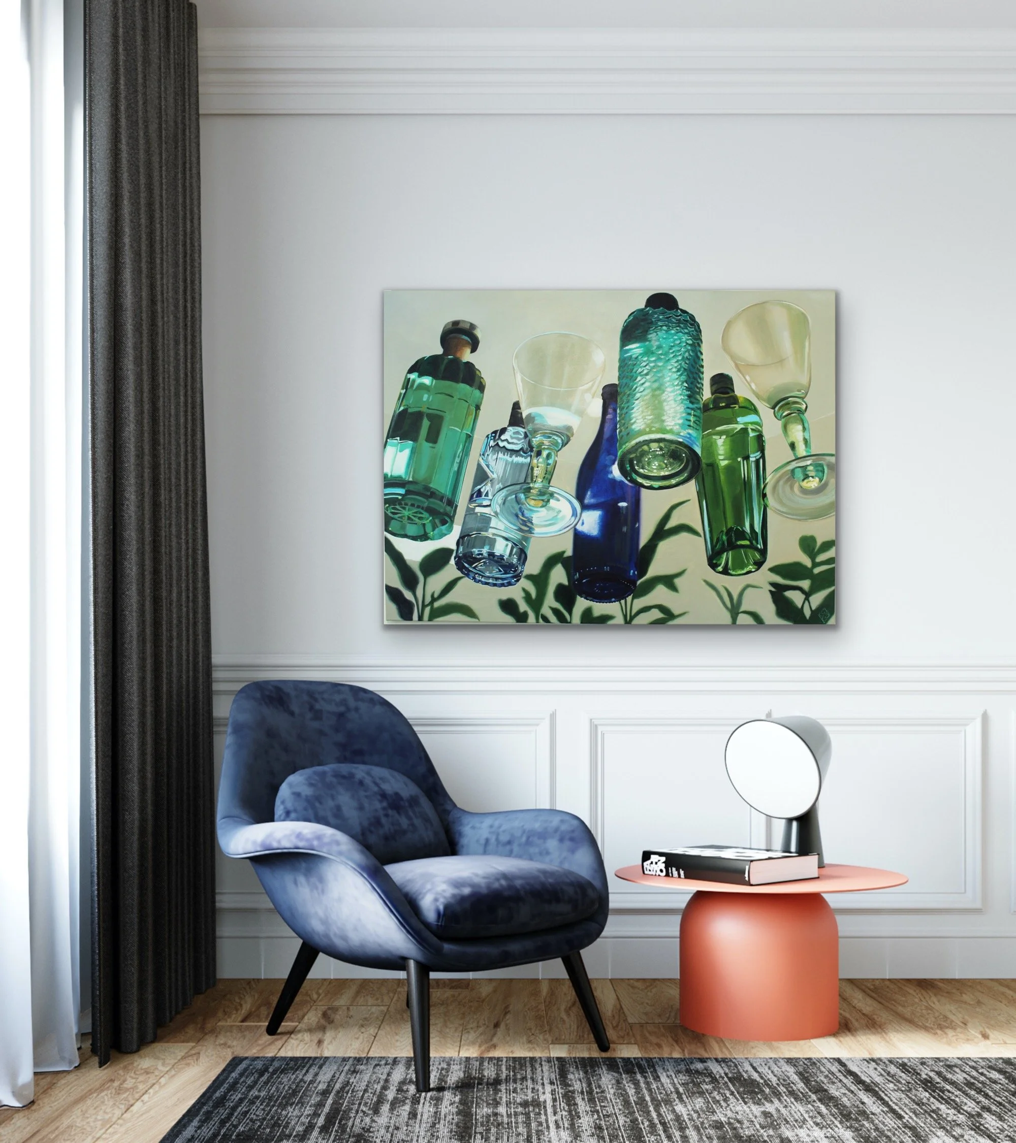 Rhythm & Blues creates a quiet kind of excitement wherever you hang it. This piece is a celebration of the aquas, emerald greens, and rich cobalt blues of a collection of beautiful glass bottles. Viewed from the bottom up, this composition is architectural and somewhat surreal. Make it a focal point in your living space, an invitation to your bar area, or an energizing pop of color in your library.